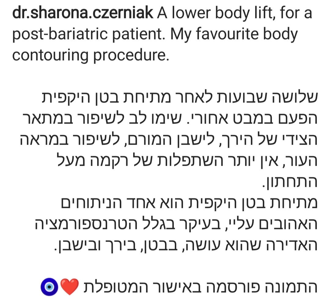 התמונה פורסמה באישור המטופלת 🧿❤️ וניתן לראות את עודפי העור שהוסרו ושומן שנשאב