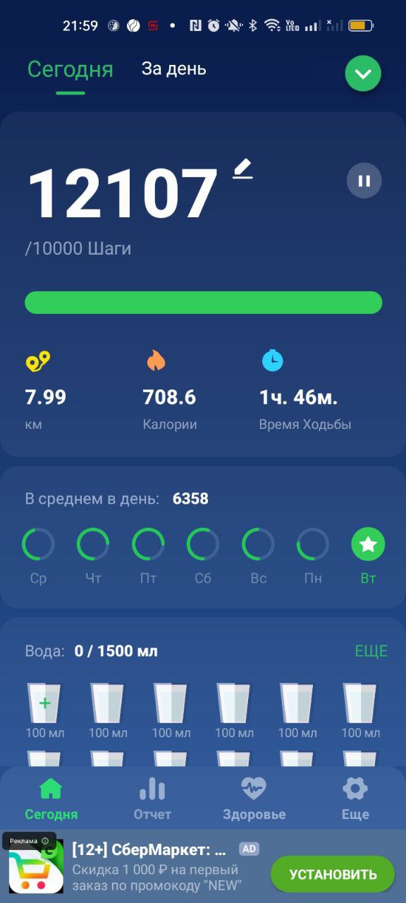 Утренние шаги плюс активность за день прозожу 10000-12000 шагов